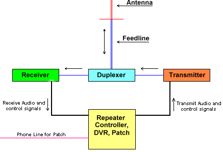 At first glance, a repeater might appear complicated, but if we take it apart, piece by piece, it's really not really so difficult to understand. A basic repeater consists of several individual pieces that, when connected, form a functional system. Here's a simple block diagram of a repeater: